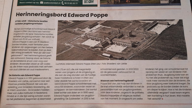 Artikel in de Etten-Leurse Bode van 19 juni 2024. Broeder Wout, overste van de broeders van Liefde, en oud pupil Armand Bergers onthullen het herinneringsbord
